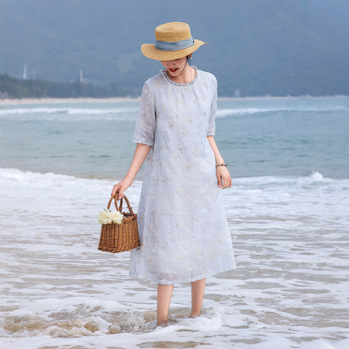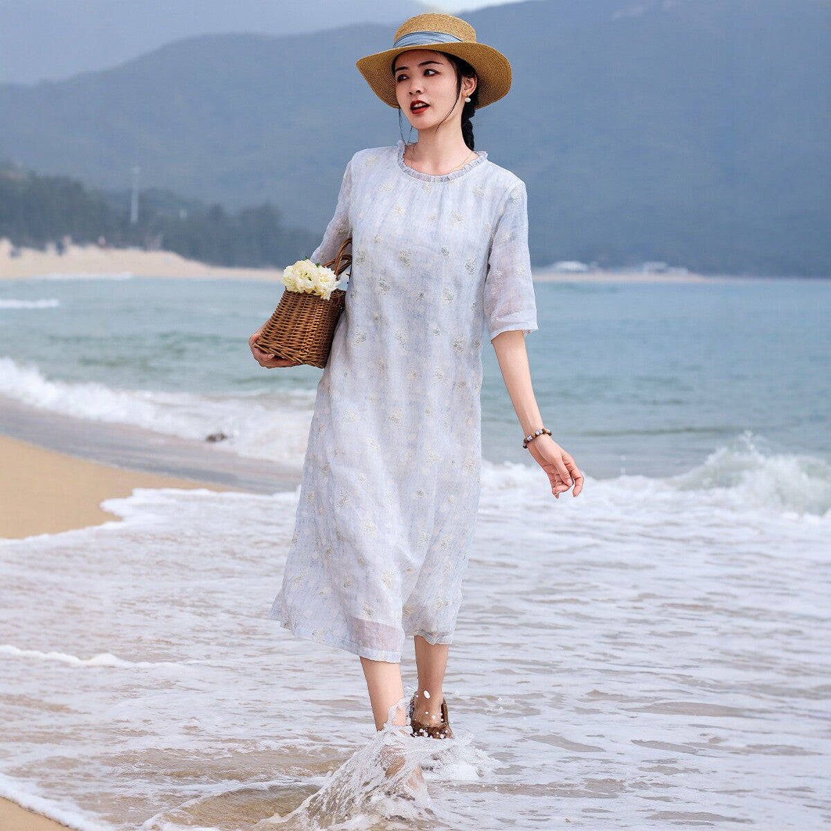 Thea Honed Ramie Cheongsam Dress Floral Embroidered Qipao