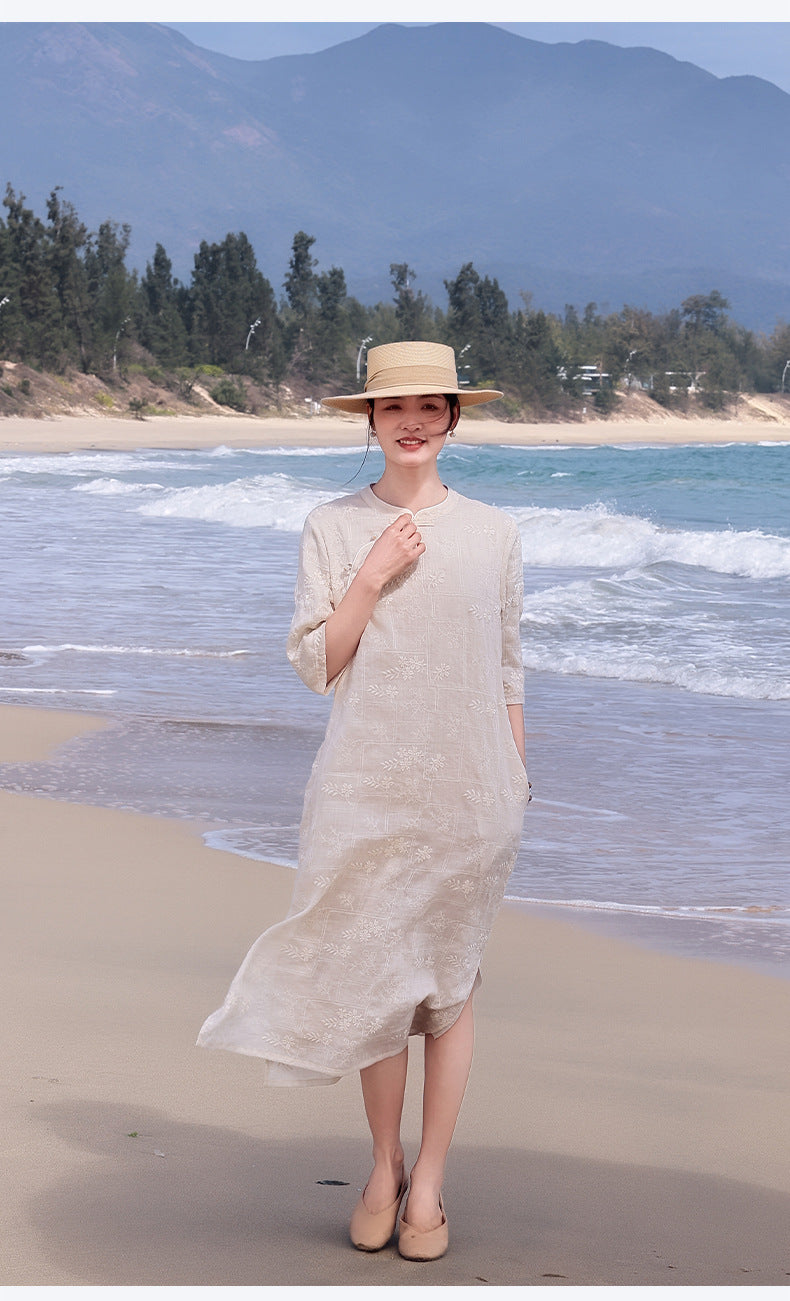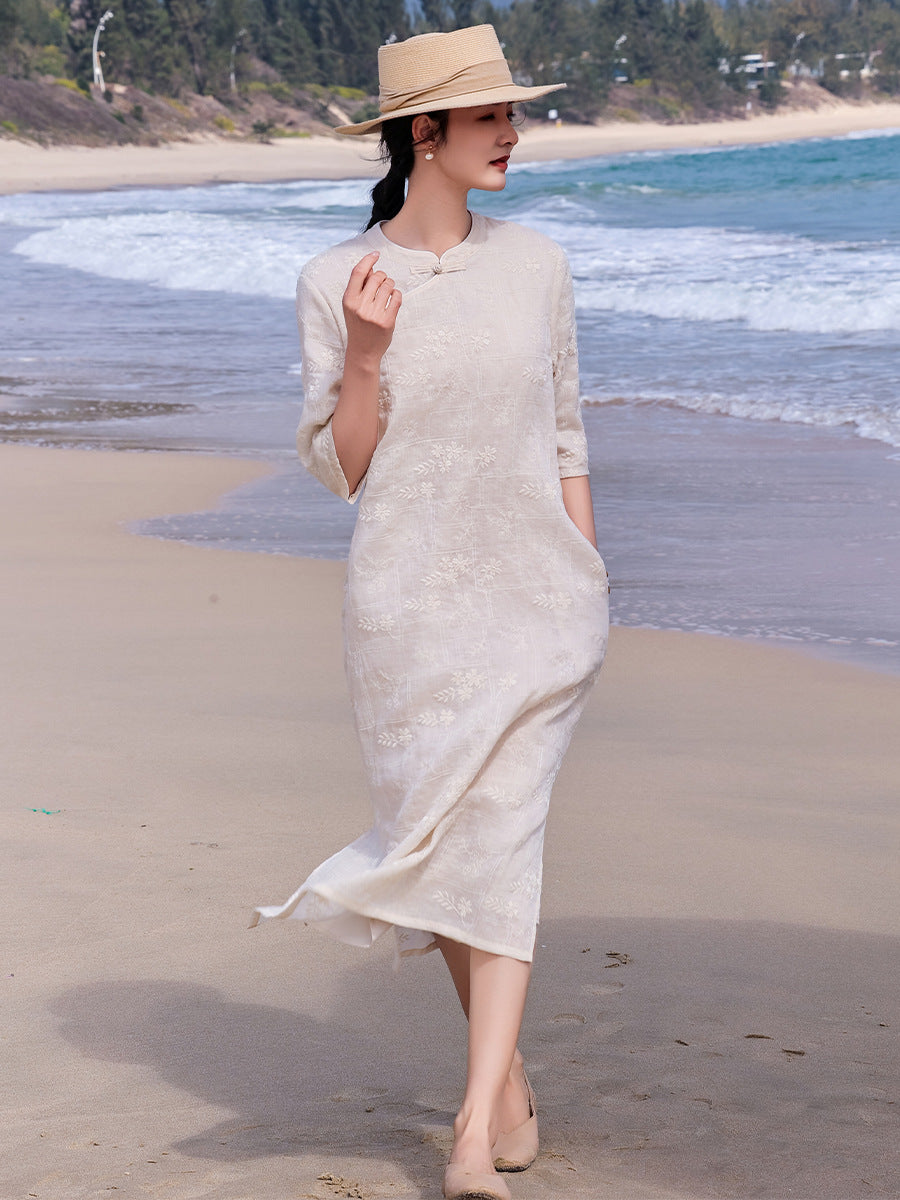 Narcissus Ornate Ramie Floral Embroidered Cheongsam Dress Stand Up Collar Qipao