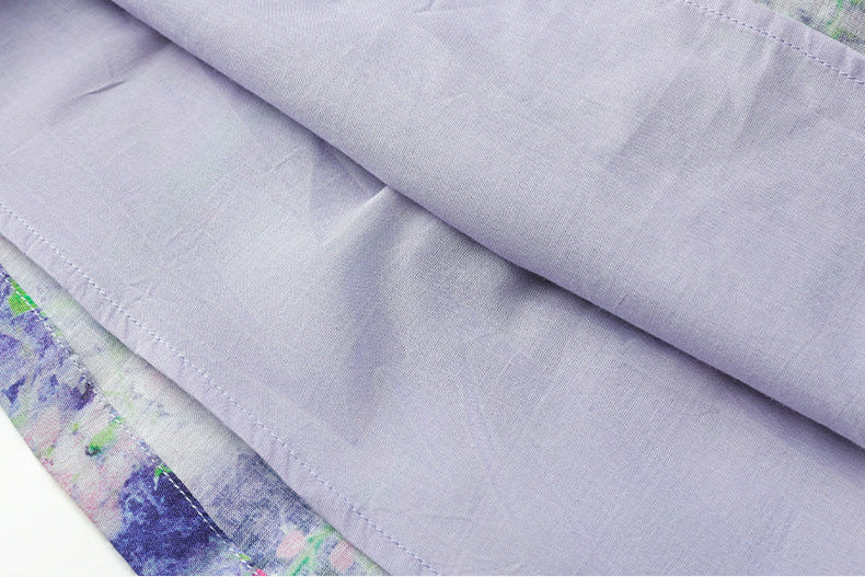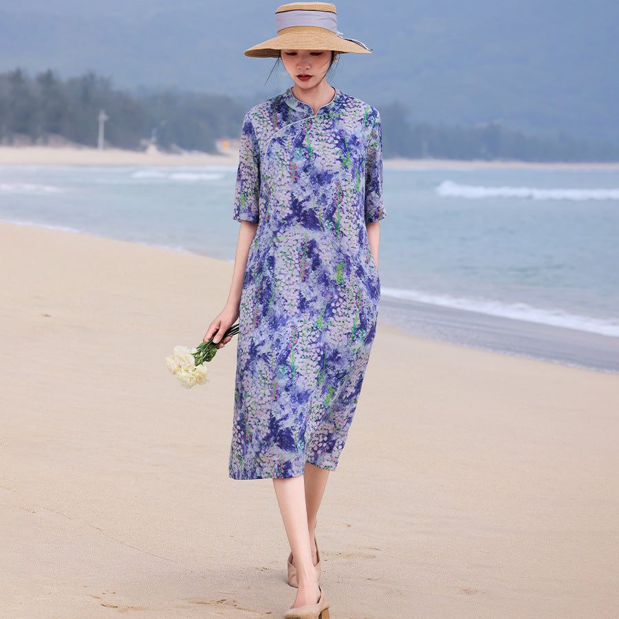 Satin Editorial Ramie Printed Cheongsam Dress Diagonal Collar Qipao